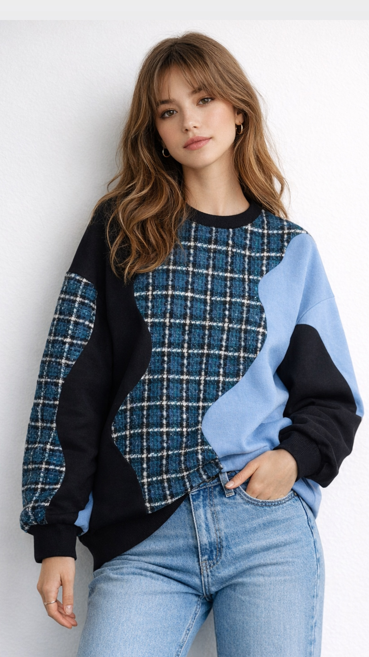 Prabangus oversized tipo džemperis, kuriame dera minkštas trikotažas iš pūkelio ir aukštos kokybės tvido audinys.